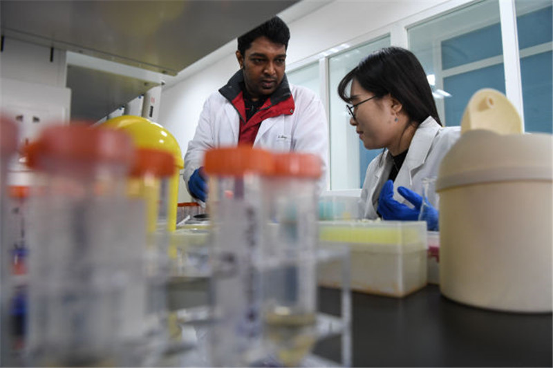 2017年12月13日,在天津大学药学院实验室,2015级硕士研究生刘笳昕(右)和印度博士后普拉迪普拉杰在做实验。新华社记者 申宏 摄