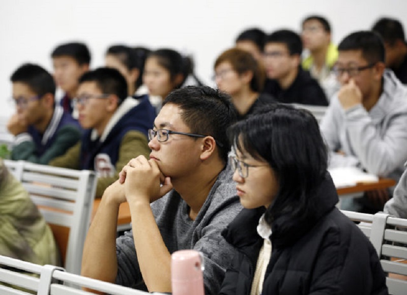2017年10月23日,天津大学学生在思修课上听教师介绍十九大精神。