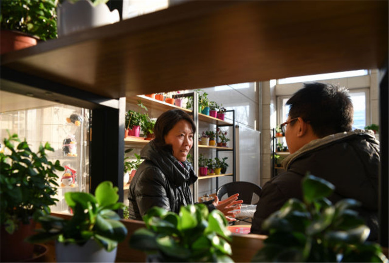 2017年12月13日,冯翠玲(右)和天津大学博士生导师、国家光纤传感973计划首席科学家刘铁根交流学习十九大报告的心得体会。刘铁根说,2017年天津大学以第一完成单位身份获得国家技术发明二等奖,今后将在十九大精神指引下带领团队继续努力,取得新突破。新华社记者 申宏 摄