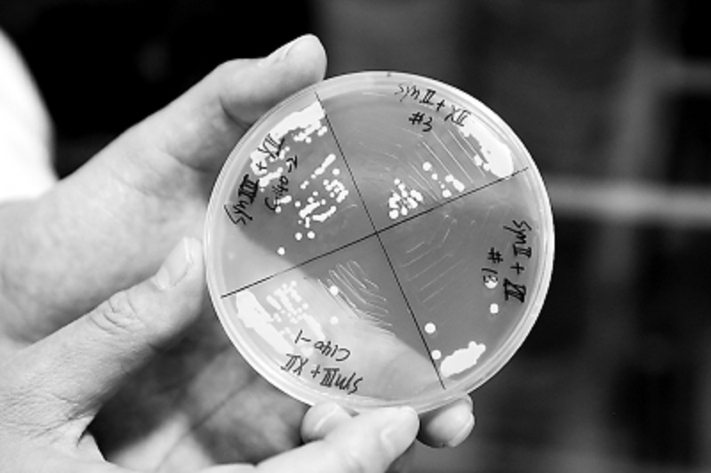 3月9日,清华大学生命科学学院戴俊彪博士在展示培养皿中的酿酒酵母菌株。