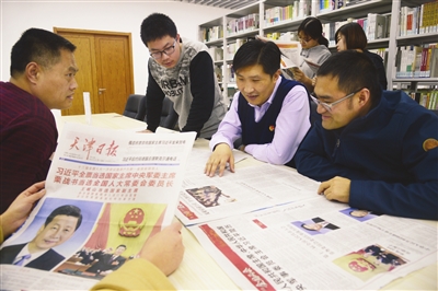 (河西区图书馆党员干部及读者认真学习领会两会精神。本报记者 张磊 摄)
