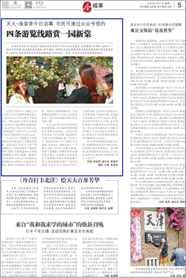 在4月5日,卫津路与北洋园双校区同步推出四大主题游览线路。游客可沿“百卅天大情”“争先敢担当”“学府文脉传”“满园海棠春”线路,在铭德道800余株海棠的馥郁芬芳中,触摸一棵棵70余年树龄的古木;在北洋园校区海棠堤1300余株16个品种的花影间,感受“百卅荣光”的岁月沉淀。两校区花期错峰绽放,卫津路最佳观赏期为4月初,北洋园则延后一周,为游客提供更长的赏花窗口期。