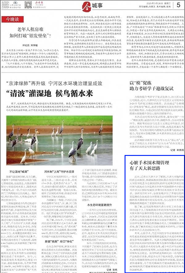 近日,记者从天津大学了解到,天津大学胸科医院郭志刚教授、韩建阁教授团队联合美国印第安纳大学医学院孟令忠教授团队的研究成果《多部位组织氧与血流动力学监测在非体外冠脉搭桥术中的应用评估》在国际权威医学期刊《英国医学杂志》发表。该研究历时3年,全面客观评估了多部位组织氧监测结合血流动力学管理方法对择期非体外冠脉搭桥围术期管理中的实际效用,为心血管手术围术期精准管理提供了重要科学依据。