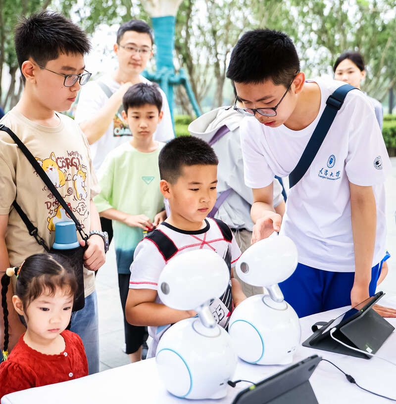 天津大学学生在给小朋友讲解人工智能机器人。天津大学供图