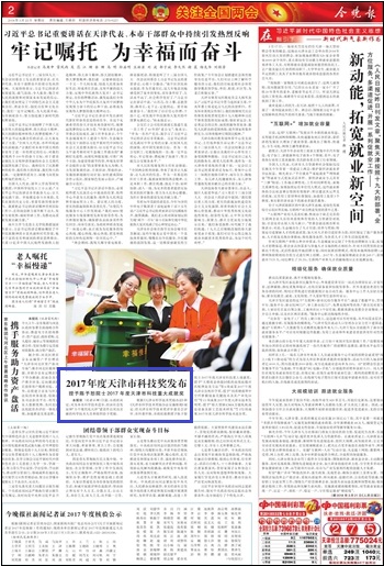 根据《天津市科学技术奖励办法》和《天津市科学技术奖励办法实施细则》规定,经天津市科学技术奖评审委员会评审、市科委审核,市政府批准授予陈予恕院士2017年度天津市科技重大成就奖,授予“大梯度余热能回收的高效底循环匹配理论及方法”等6项成果2017年度天津市自然科学奖,授予“同质增强型中空纤维膜制备关键技术及其产业化应用”等11项成果2017年度天津市技术发明奖,授予“特大型钢CMA万能轧机成套设备及新工艺技术研发”等172项成果2017年度天津市科学技术进步奖。