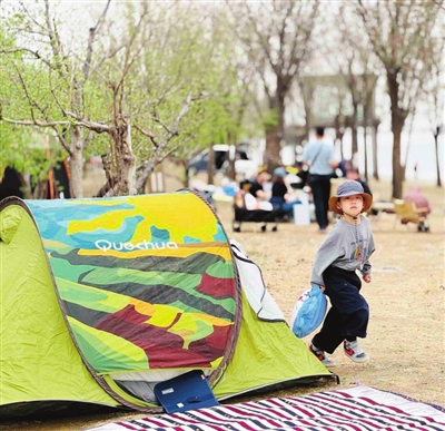 “早晨7点多我就起来收拾各种露营装备,孩子妈妈负责打包各种水果、零食,从市里开车过来半个多小时,到了这再支帐篷、布置餐垫子和桌椅,你看现在快10点了,才开始享受!”在东丽湖附近的郊野公园,刚刚布置完露营场地的市民罗骏告诉记者,虽然过程辛苦,但坐在树下喝着手磨咖啡,看着两个孩子在草地里嬉戏的那一瞬间,觉得一切都值得。提起自己的露营装备,从2023年春天才开始置办装备的他坦言,刚开始买的都比较专业高端,帐篷、露营车、桌椅、卡式炉、便携餐具等等,一套下来花了5000多元。去年开始,随着露营的经验越来越丰富,他发现不在野外过夜只是轻度露营根本用不上专业的设备,于是便在二手平台上卖掉了自己又重又贵的专业防风帐篷,转而购买一些更为轻便、实用的“平替”。