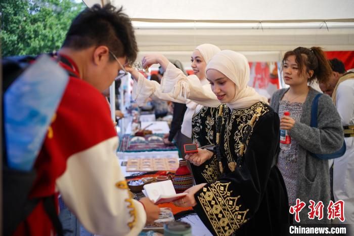 5月10日,天津,埃及留学生与现场参观者互动。当日,以“上合之约 津彩国际”为主题的天津市外国留学生文艺展演暨天津大学第十五届国际文化节举办。来自全球近50个国家的千余名在津留学生欢聚天津大学,通过歌舞展演、国家展台展览、风味小吃制作与品尝等形式,向参观者展示各国的人文风情。中新社记者 佟郁 摄