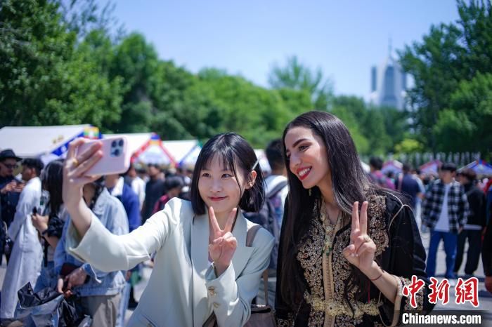 5月10日,天津,来自摩洛哥留学生与参观者互动合影。当日,以“上合之约 津彩国际”为主题的天津市外国留学生文艺展演暨天津大学第十五届国际文化节举办。来自全球近50个国家的千余名在津留学生欢聚天津大学,通过歌舞展演、国家展台展览、风味小吃制作与品尝等形式,向参观者展示各国的人文风情。中新社记者 佟郁 摄