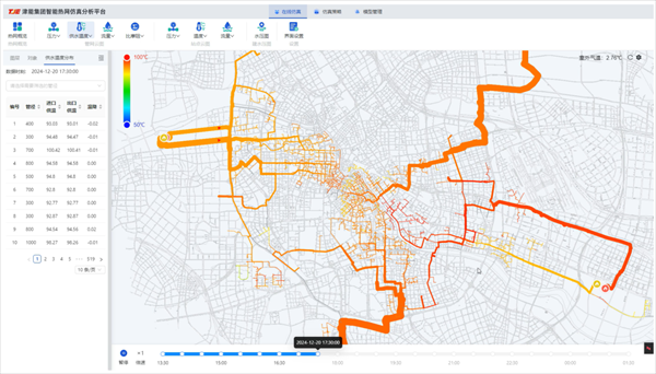 天津市中心城区大热网1800余个换热站动态压差分布的在线仿真。