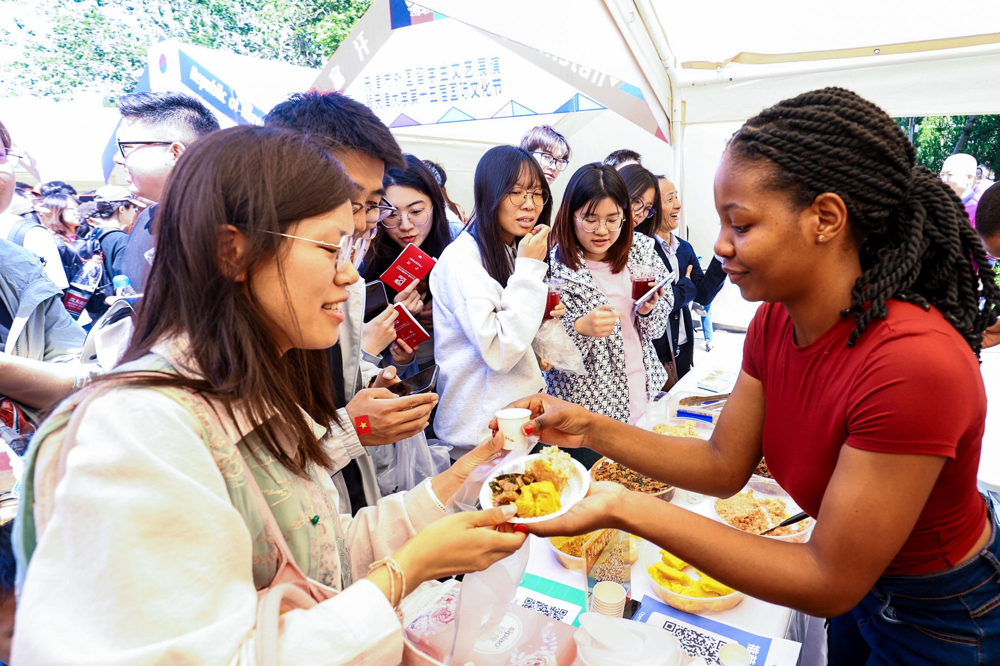 这一天,近50个文化展位沿天津大学北洋广场精彩铺陈,形成流动的“地球村”。马来西亚展区内,椰浆饭与沙爹的浓郁香气交织成南洋风味长廊,身着娘惹服饰的留学生邀请观众进来体验“海娜手绘坊”,他们以木槿花为灵感,在观众手背绘制象征两国友谊的图腾;柬埔寨展位则以牛皮雕塑和哈努曼面具吸引目光,邀请游客近距离观看欣赏,同时体验柬埔寨的独有甜品;摩洛哥的外国留学生们身穿传统服饰,邀请游客试穿体验,并和他们互动独有的马赛克拼贴艺术。此外,埃及的米布丁、泰国的奶茶、越南的河粉等都吸引了大批观众共享美食盛宴。为了让更多的留学生了解中华优秀传统文化,今年活动还增设了琳琅满目的“非遗小工坊”:画年画、做风筝、编绒花……中外学生纷纷驻足体验,与非遗专家交流互动,动手探索丰富多彩的民俗风情。