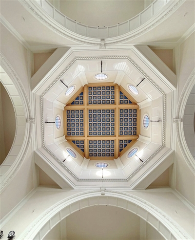 在文物保护工程现场查勘这个环节经常会有很多意外发现,有的时候研究人员凭资料推断的情况与现场看到的差别很大,有时候甚至是另外一番景象。例如,张志成第一次仰望圣心堂的顶棚,当时因为距离太远看不清晰,初步判断顶棚是浮雕藻井,但是后来通过脚手架攀上高处,在距离屋顶1.5米距离观看时,发现屋顶竟然是当年的匠人运用彩绘技法绘制出了立体效果。