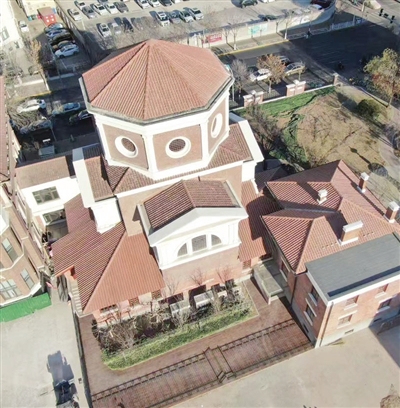 2月28日下午,记者来到修缮后的圣心堂旧址。圣心堂是一幢二层结构的建筑,八角形屋顶特别显眼。整座建筑用红砖砌筑,外立面配以科林斯柱式壁柱进行装饰,具有很高的艺术价值,两扇暗红色大门上部的半圆形窗户极具年代感。