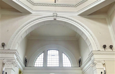 不仅如此,在修复铁艺灯架时,张志成介绍,他们刚进入圣心堂室内时,发现铁艺灯架原来是安装在一层和二层的墙体上,位于二层的灯架都保留了,一层的灯架却都不见了,为了能恢复原貌,并且确定灯架上原来安装的是灯泡还是蜡烛,他们找来一张圣心堂建成时室内老照片进行对比,初步判断是电灯,但是因为照片清晰度不高,无法确认。后来他们通过查询资料了解到,圣心堂建设时,当时的建国道已经是通上电的大马路,因此才确认铁艺灯架上安装的是灯泡而非蜡烛,最后将灯架和灯泡全部补齐。
