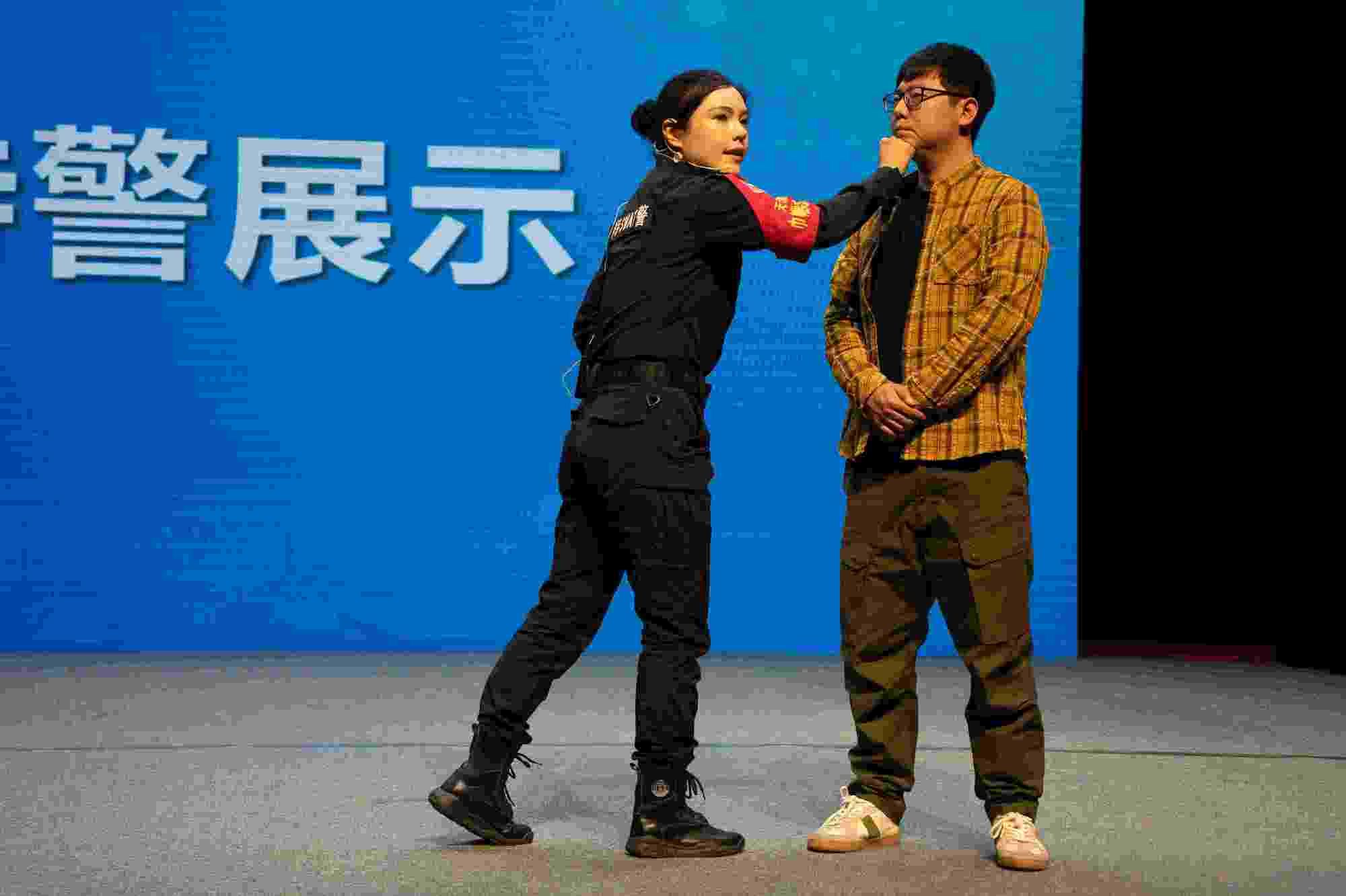警官为同学们进行防身术展示(央广网发 陈文超 摄)