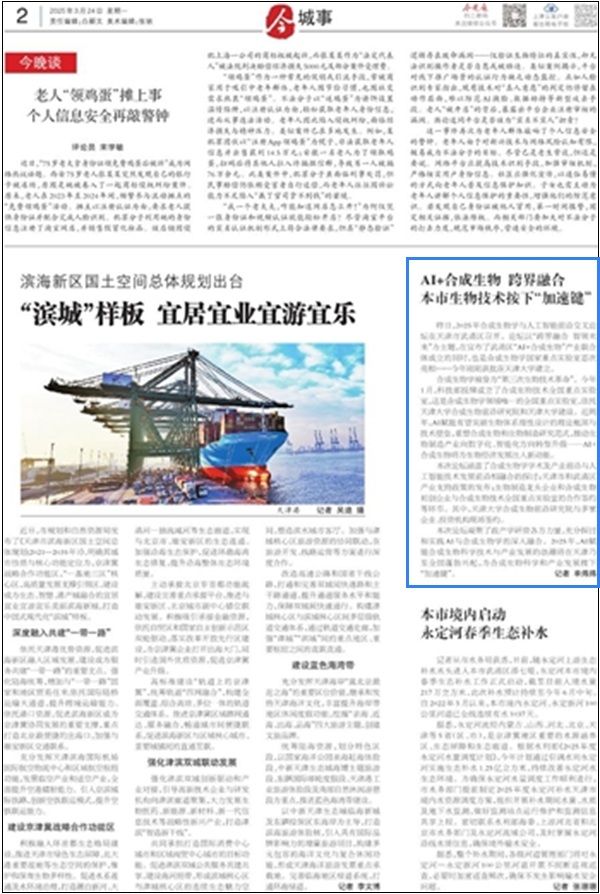 本次论坛凝聚了政产学研资各方力量,充分探讨和实践AI与合成生物学的深入融合。2025年,AI赋能合成生物科学技术与产业发展的浪潮将在天津乃至全国蓬勃兴起,为合成生物科学和产业发展按下“加速键”。记者 单炜炜