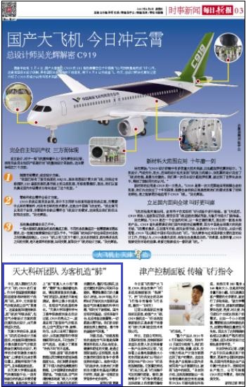 今日,国人期盼已久的国产大飞机C919进行首飞。作为中国首款按照最新国际适航标准研制的干线民用飞机,其中,它的新型空气分配系统让空气“更清新”。这套座舱环境控制系统,即飞机的“呼吸系统”,包括空气分配设计方案的数值仿真和优化设计,由天津大学团队完成。