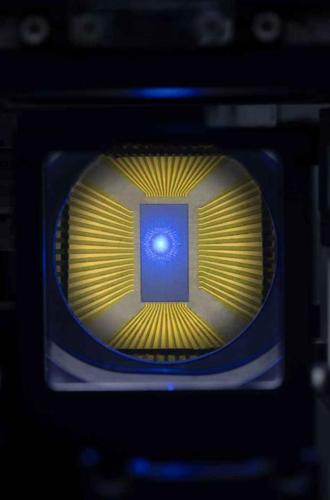 图为测试系统中的柔性探针,当探针接触LED晶圆后点亮其中的一个LED发出蓝色光,通过同轴光路可观察光强和波长信息。(受访者供图)
