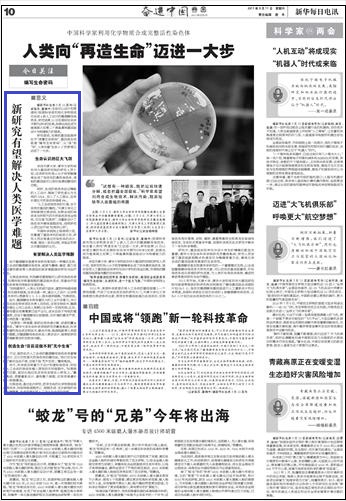 研究者说,如果把基因组测序比作“读懂生命密码”,基因组合成就是“编写生命密码”,从“读”到“写”,人类向着“生命2.0”的梦想又迈进了一大步。
