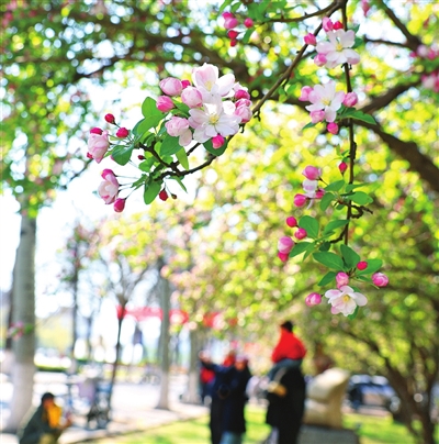 昨天,天津大学校园内部分海棠花业已绽放,吸引了人们前来拍照。 记者 姜宝成 摄