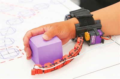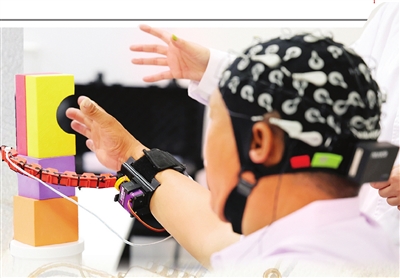 人员调试好设备后,先为张先生戴上有64个电极的“脑电帽”,并在每个接口中注入导电凝胶,然后将“灵犀指”装置固定在右手腕。“手不动,只用脑子想”,经过几分钟准备,张先生开始“用意念指挥手指”,成功地启动“灵犀指”,并将两个方块摞放起来。之后,新利18网址登录