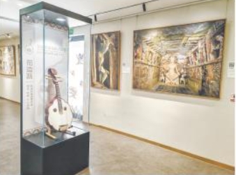 如,“反弹琵琶”一直以来都是人们心目中敦煌的“文化标签”。展览展出了莫高窟第112窟的南壁《观无量寿经变》中的一幅乐舞图,画面中,乐师们拿着横笛、箜篌等乐器在演奏,位于中间位置的正是“反弹琵琶”的舞者。这个经典意象凭借独特的艺术魅力,穿越时光长河,烙印在人们心中。动画片《九色鹿》曾是“80后”“90后”不可磨灭的童年回忆,它是根据莫高窟第257 窟《鹿王本生图》改编而成的,本次展览截取了中间的一部分进行展出。动人的故事与敦煌壁画独特的艺术神韵、美学价值一起流传至今。