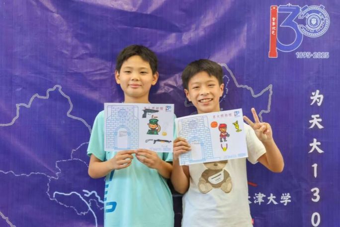 午后的校园里,“星火照相馆”格外热闹。蓝色幕布前,“为130岁的天大拍张祝福照”的标语吸引孩子们举画排队留影。六岁的星睿是年龄最小的参与者,稚嫩小手一丝不苟地在画纸角落点缀星星。她认真地说:“老师告诉我们,哥哥姐姐们就是从天大带着知识的‘星星’来照亮我们的。”画纸边缘,孩子们用心写下对天大百卅校庆的祝福,笔触稚拙却情意真挚。这些沾染煤屑气息、浸润蜡染温度的作品,以数字化方式跨越山河抵达天大,见证着一所大学的精神力量如何穿透地域阻隔,在幼小心灵播下求知与梦想的种子。