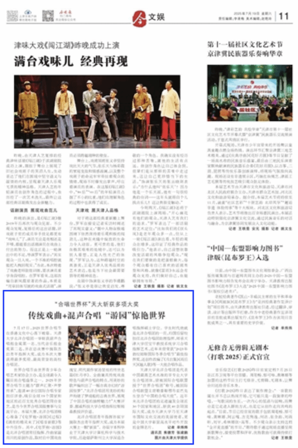 世界合唱节由世界青少年合唱艺术家协会主办,是全球最令人瞩目的合唱盛事之一。2025年世界合唱节主题为“群声汇聚·声梦传承”,邀请40余位国际合唱专家担任评委,吸引全球19个国家和地区的近百支优秀合唱团同台竞艺,是当今世界合唱顶级赛事与交流平台。本届大赛,北洋合唱团精心准备了《皂罗袍·游园》《过程》《调皮的精灵来了》《唱首新歌》等中外佳作。其中,《皂罗袍·游园》是北洋合唱团常任指挥、作曲家温雨川的原创作品,取材自中国戏曲瑰宝、明代剧作家汤显祖的传世名篇《牡丹亭》。全曲兼具传统戏曲特色与混声合唱的特点,用美妙的歌声编织出了一幅亦真亦幻的“游园惊梦”。“北洋合唱团用美妙的和声构建了梦境般的古典世界,展现了中国合唱的独特魅力!”大赛评委、挪威科技大学合唱指挥拉斯姆森教授评价道。