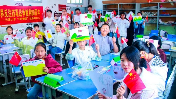 时值中国人民抗日战争暨世界反法西斯战争胜利80周年,天津大学实践队聚焦“抗战精神润童心”主题,精心设计了系列贴合孩子年龄特点的课程。在磑子坝小学的课堂上,队员汤东来以一段抗战题材影视片段切入,用生动的故事引领孩子们走近烽火岁月,从自强不息的民族意志讲到今日和平生活的来之不易。“天下兴亡,匹夫有责!”铿锵的朗诵声在山谷间回荡,孩子们稚嫩的嗓音合唱国歌、诵读《少年中国说》,清澈的眼神中闪烁着对未来的憧憬。