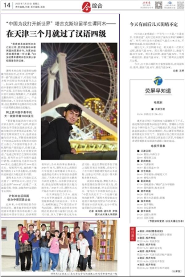 近年来,中塔两国经贸合作持续深化。越来越多的塔吉克斯坦青年看到中国市场的潜力,纷纷前往中国学习语言、经济和贸易知识,为未来的事业做准备。2024年12月,谭阿木在山西财经大学攻读工商管理硕士毕业后,他选择赴天津大学参加汉语进修项目。“天津大学在国际学生教育方面历史悠久,汉语教学体系完善,很适合短期内提高语言能力的学生。”2025年3月,谭阿木正式开始在天津大学的汉语学习。