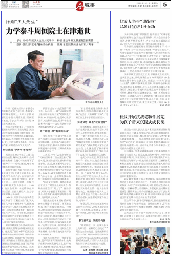 周恒曾同时考取了同济大学和北洋大学(天津大学前身),最终选择了北洋大学。在解放天津的战火中,他参加了护校队,把北洋大学——这所中国第一所现代大学顺利交到人民手中。1950年,他以全班第一的成绩毕业并留校任教,从此扎根天大,在力学领域深耕七十余载。