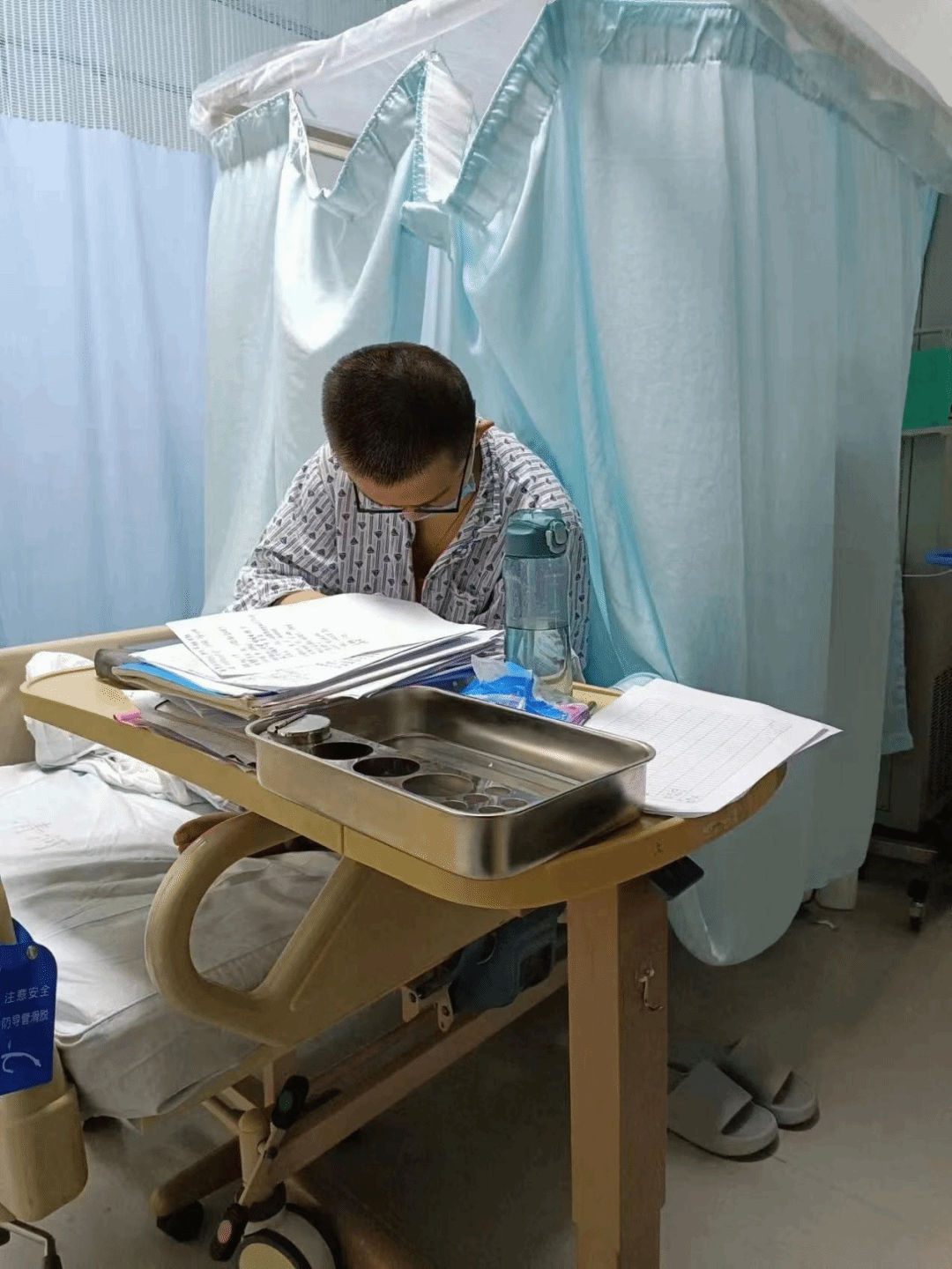 他左手扎着留置针,右手握笔