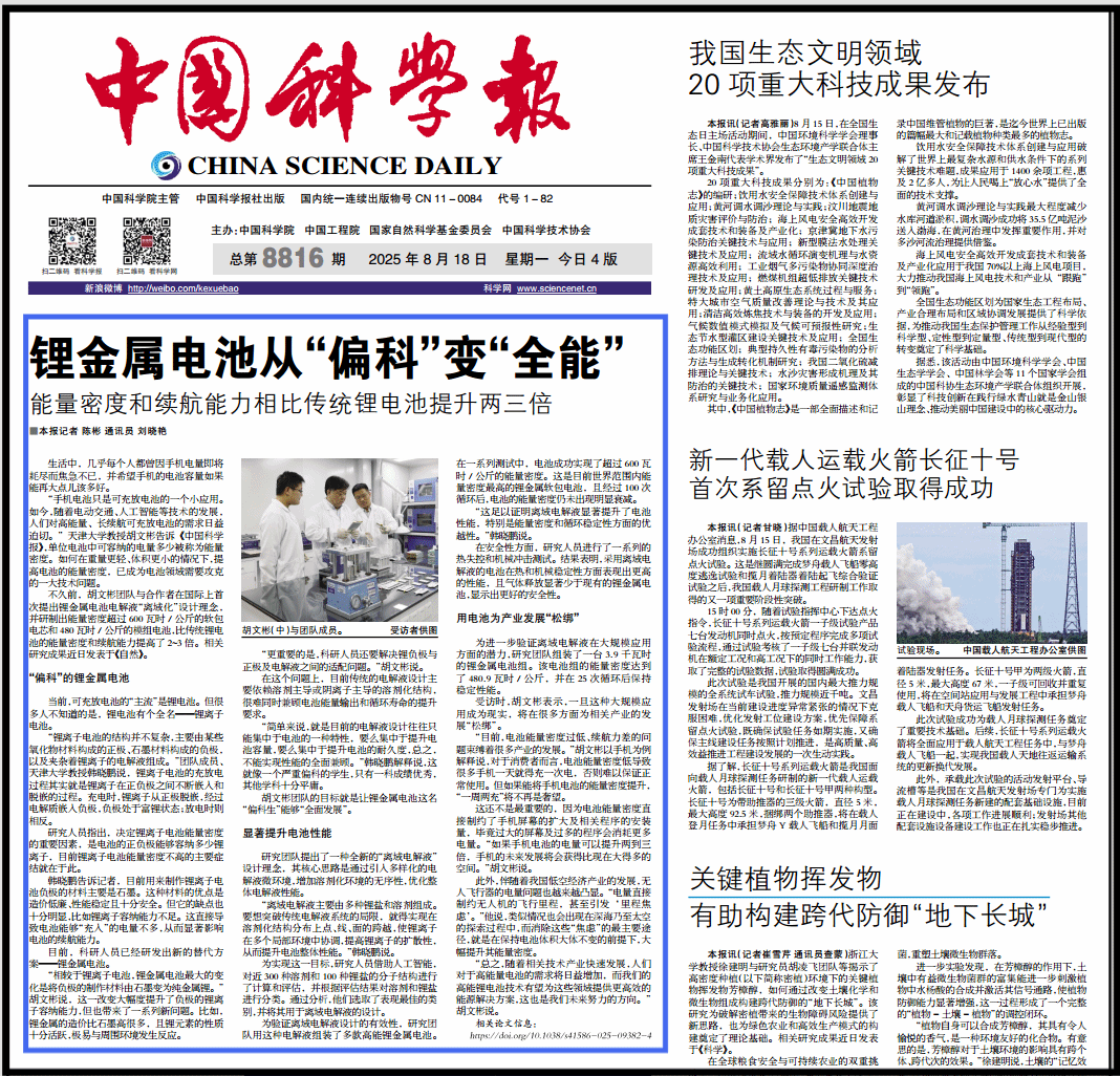 胡文彬团队的目标就是让锂金属电池这名“偏科生”能够“全面发展”。