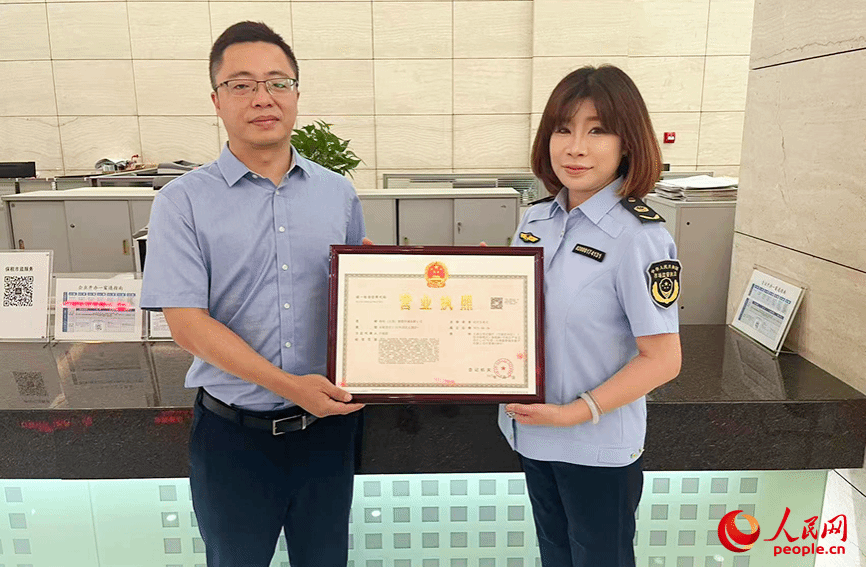 8月28日,海珀集团员工领取新成立的物流领域公司营业执照。人民网 郭维瑾摄