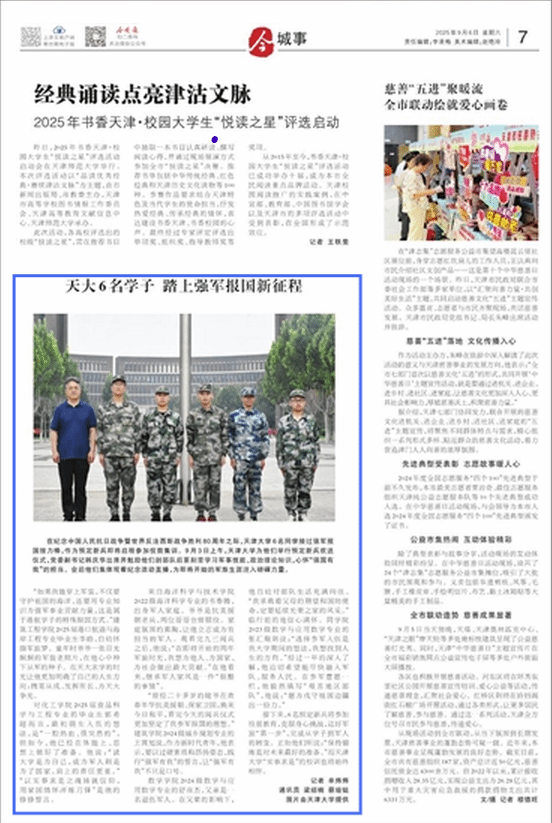 在纪念中国人民抗日战争暨世界反法西斯战争胜利80周年之际,天津大学6名同学接过强军报国接力棒,作为预定新兵即将启程参加役前集训。9月3日上午,天津大学为他们举行预定新兵欢送仪式,党委副书记韩庆华出席并勉励他们到部队后要刻苦学习军事技能、政治理论知识,心怀“强国有我”的担当。会后他们集体观看纪念活动直播,为即将开始的军旅生涯注入磅礴力量。