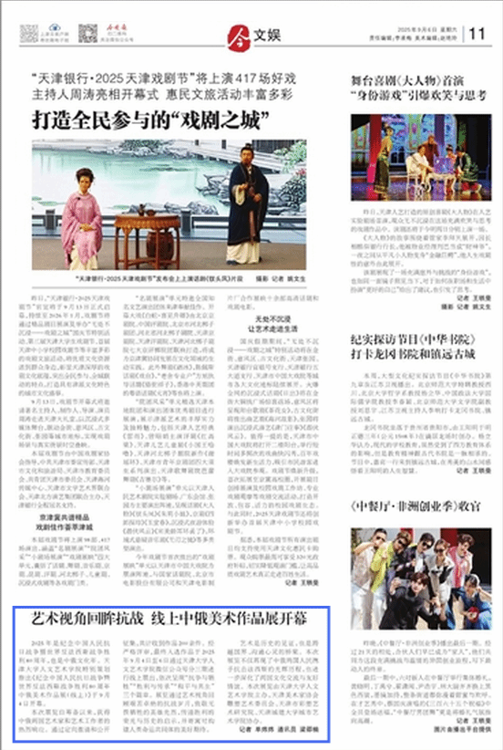 2025年是纪念中国人民抗日战争暨世界反法西斯战争胜利80周年,也是中俄文化年。天津大学人文艺术学院特别策划推出《纪念中国人民抗日战争暨世界反法西斯战争胜利80周年中俄美术作品展(线上)》于9月4日开幕。
