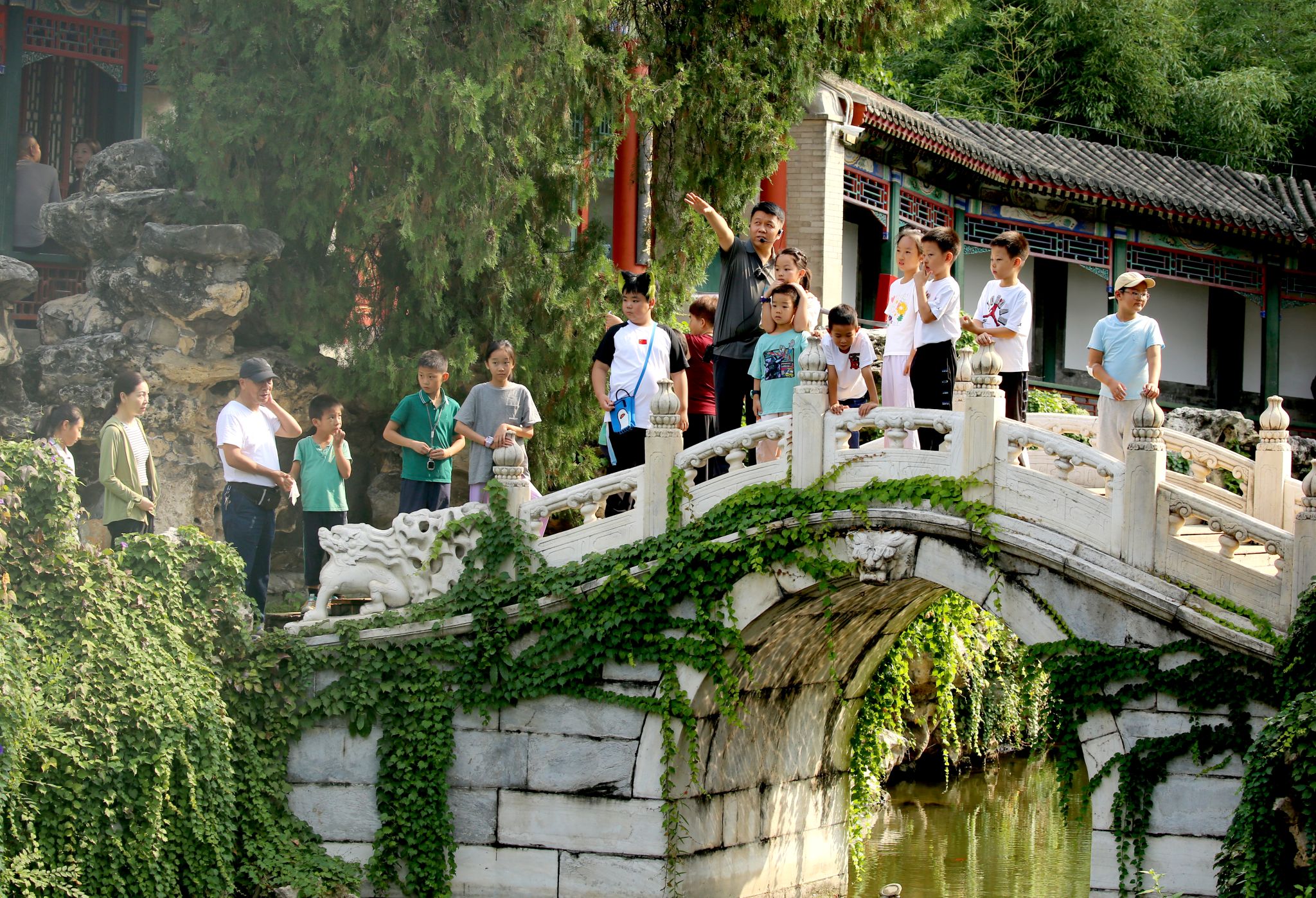 9月13日,参加园林与建筑文化科普活动的小学生在濠濮间听志愿者讲解园林知识。