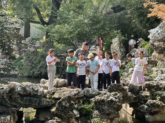 本次活动以“园林与建筑文化”为主题,通过专业讲解、沉浸体验和动手实践等方式,深入浅出地展示北海公园的历史底蕴和造园艺术。十余名小学生在天津大学建筑学院张凤梧教授的带领下依次走访静心斋、濠濮间、琼华岛等代表性景点,系统了解了北海在园林布局、建筑形制、山水意境等方面的独特价值,在亭台廊阁、叠山理水之间,感受传统,领略古典园林之美;在摆渡船上唱响“让我们荡起双桨”,重温历史,表达对祖国的热爱。