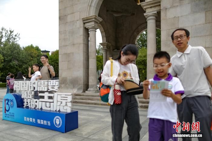 10月2日,校友在天津大学卫津路校区北洋广场与建校130周年主题标识合影。中新社记者 佟郁 摄