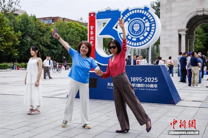 10月2日,校友在天津大学卫津路校区北洋园与建校130周年主题标识合影。中新社记者 佟郁 摄