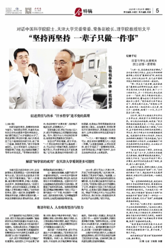团队。”在担任天津大学校长助理、理学院院长以及副校长期间,胡文平致力于推动化学、材料科学与微电子技术的多学科交叉研究。他领导的研究团队克服了电荷输运等多项难题,取得了显著的研究成果。