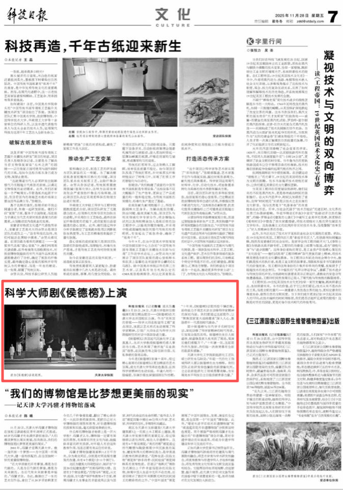 11月23日、24日,天津大学组织创排编演的原创精品剧目《侯德榜》在北洋园校区公演。作为“共和国的脊梁——科学大师名校宣传工程”重点项目,该剧以艺术形式生动展现了科学家精神的时代价值,引领广大师生在跨越时空的对话中汲取奋进力量。