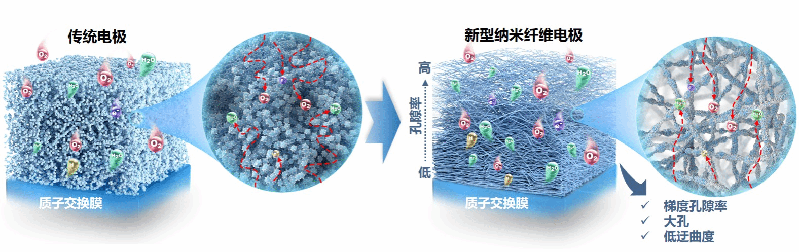 “理想的燃料电池电极结构应具备良好的三相反应界面,能够促进电池内部的气体传输与液态水管理。”焦魁介绍,“新型电极具有梯度孔隙率、更大的孔和更低的迂曲度,可明显改善低铂燃料电池的电化学性能和耐久性。”