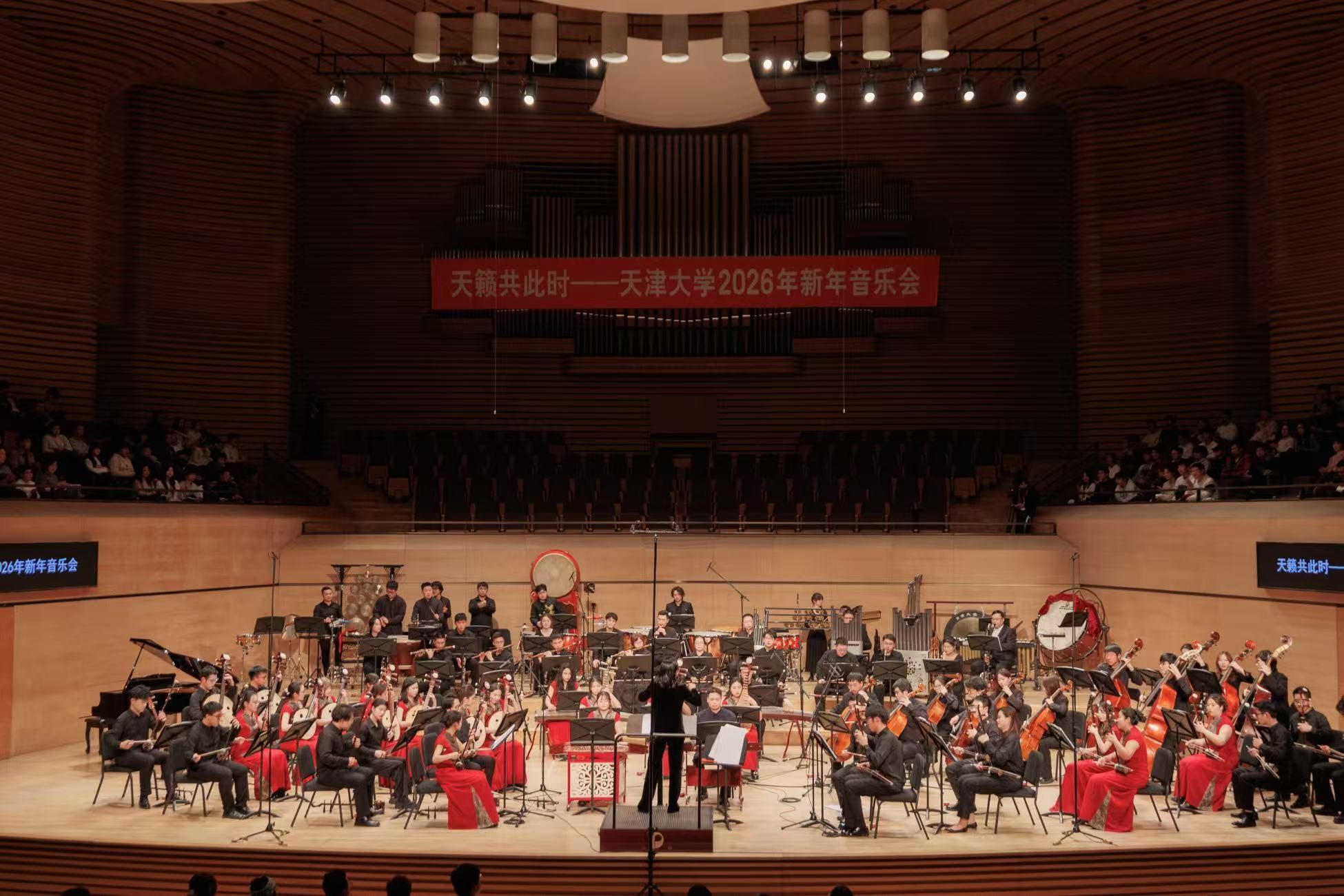12月22日晚,“天籁共此时——天津大学2026年新年音乐会”在天津大剧院奏响。天津大学北洋军乐团与北洋民族管弦乐团联袂献艺,以中西合璧、气势恢宏的音乐盛宴,为师生校友和社会各界观众送上了一份充满家国深情的新年贺礼。