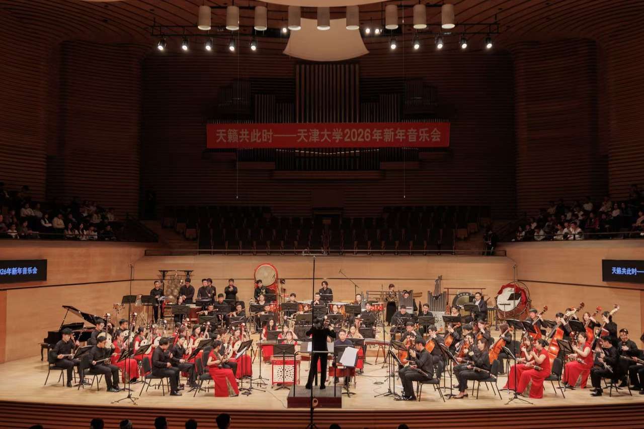 12月22日晚,“天籁共此时——天津大学2026年新年音乐会”在天津大剧院奏响。天津大学北洋军乐团与北洋民族管弦乐团联袂献艺,以中西合璧、气势恢宏的音乐盛宴,为师生校友和各界观众送上了一份新年贺礼。
