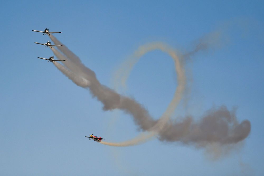 11月21日在株洲芦淞机场拍摄的动态飞行表演。当日,2025湖南(国际)通用航空及低空经济产业博览会开幕。新华社记者 陈振海 摄