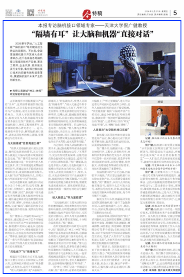去年被视作中国脑机接口产业的“元年”,这项曾带着强烈科幻色彩的技术,正从实验室走向临床应用与产业落地,成为全球前沿科技的焦点。天津大学医院管理处处长、脑机交互与人机共融海河实验室常务副主任倪广健教授,深耕听觉脑机接口、神经工程领域多年,是该领域的核心研究者之一。近日,他接受本报专访,解码脑机接口技术,讲述这项技术的核心逻辑、发展路径与应用未来。