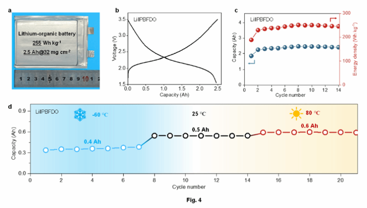 基于此材料,团队制备出一款能量密度超过250瓦时/公斤的有机软包电池,这一数值已超越目前广泛使用的磷酸铁锂电池。这款电池展现出卓越的温度适应能力,不仅能在-70℃到80℃的温度下正常工作,还兼具良好的柔韧性与安全性。