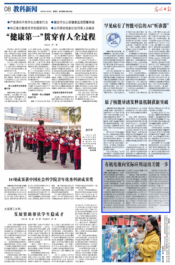 本报天津2月25日电(记者吕慎、王艺钊、朱斌)近日,天津大学许运华教授团队联合华南理工大学黄飞教授团队等,成功研制出一种新型有机正极材料,解决了传统有机锂电池“电量低”“难以实用化”等关键瓶颈。相关研究成果已于近日发表在国际学术期刊《自然》上。