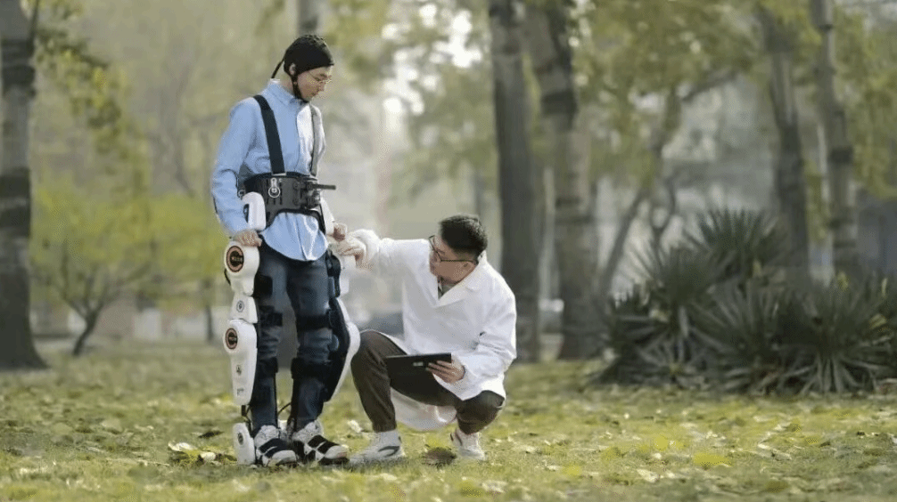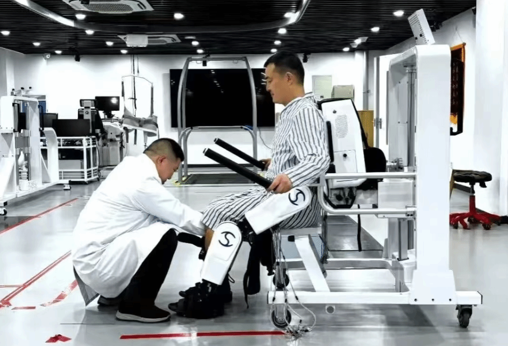 人员利用自主研发的非侵入式脑机接口设备,为他进行了两个多星期的脑控外骨骼步行康复训练。如今,他已经能短距离独立行走。