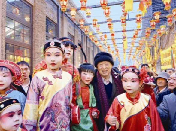 这时,“高跷闹春”活动同步开启,天津大学太雷路变身高跷PK的舞台,陈台子同乐高跷老会、咸水沽全乐高跷、葛沽长恒高跷、冯高庄同乐高跷老会、曹庄子同利文武高跷老会五大老会同台献艺,艺人们脚踩高跷,身姿矫健、动作娴熟,异彩纷呈的高跷巡游引得现场观众阵阵喝彩,在天津本土民间艺术的独特魅力中,沉浸式体验元宵民俗的热闹氛围。人群中,冯骥才拿出手机,记录下这一他最熟悉的天津民俗表演,并向在场演员抱拳致意。